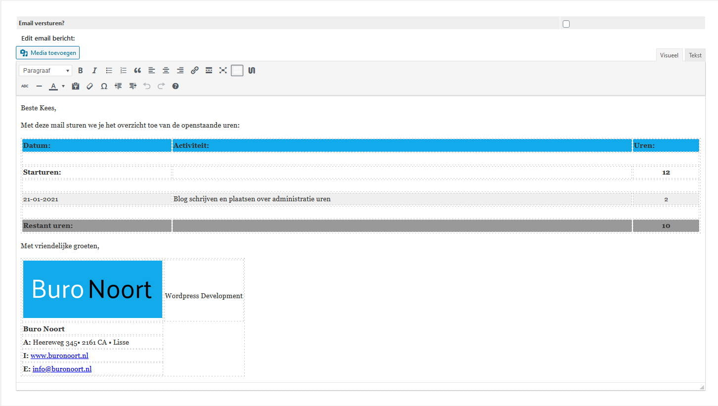 Wanneer een werkzaamheid is afgerond, kan ervoor gekozen worden om het overzicht met begin uren, activiteiten en gebruikte uren en restant uren te mailen.